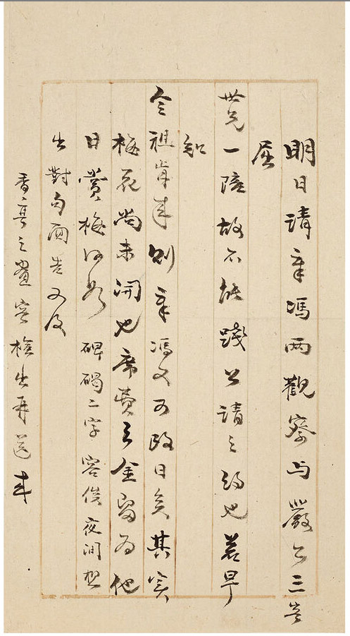 第五通释文:明日请章、冯两观察与严公三客,屈世兄一陪,故不能践公请之约也,若早知令祖前来,则章、冯又可改日矣,其实梅花尚未开也,席费之金,留为他日赏梅何如?碑碣二字,容俟夜间想出对句面告,又及。香亭之画,容检出再送来。