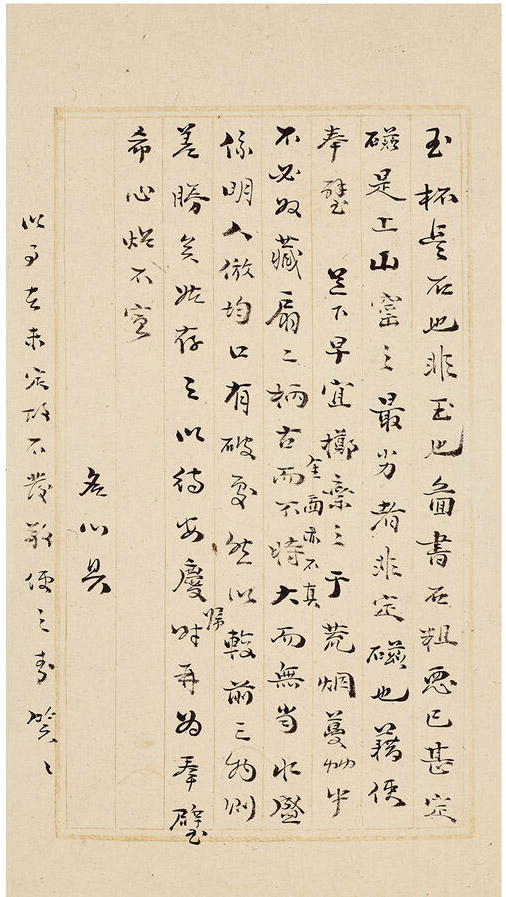 第十一通释文:玉杯是石也,非玉也,图书石粗恶已甚定磁,是上山窑之最劣者,非定磁也。藉使奉璧,足下早宜掷弃之于荒烟蔓草中,不必收藏。扇二柄,古而不特,大而无当(金面亦不真);水盛系明人仿,均口有破处,然以较前三物,则差胜矣,姑存之,以待安庆归时,再为奉璧,希心炤不宣。名心具。以事在未定,故不发,敬便之封,笑笑。