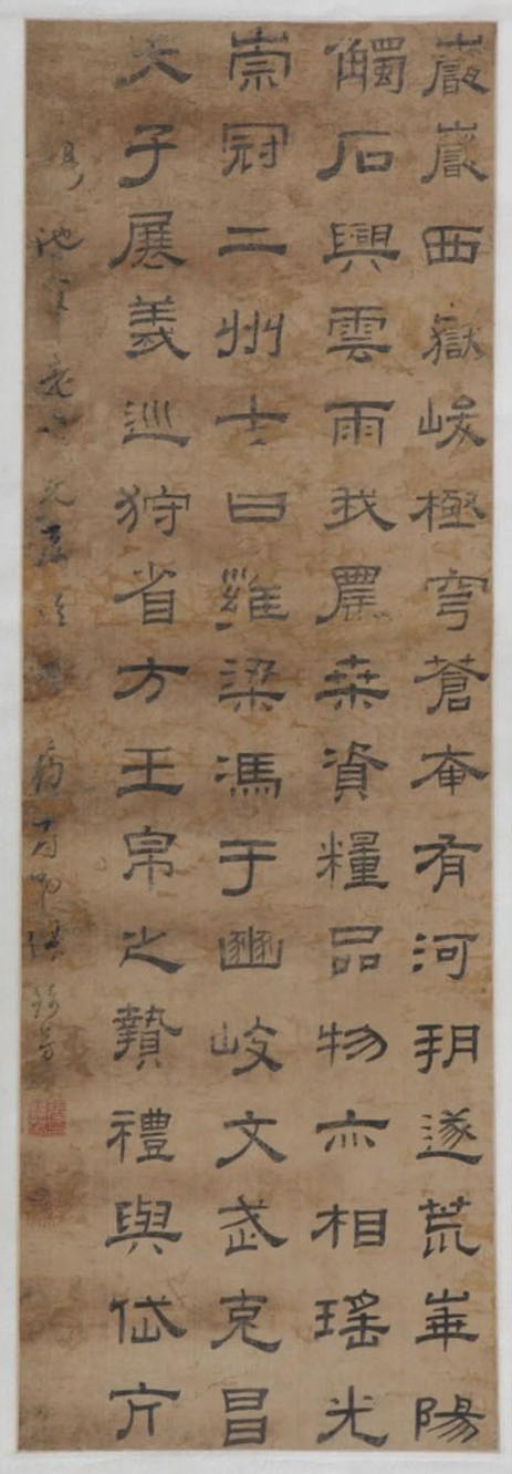 清 张锦芳《隶书节临华山庙碑轴》 109.5×36cm 顺德博物馆藏 释文:岩岩西岳,峻极穹苍。奄有河朔,遂荒华阳。触石兴云,雨我农桑。资粮品物,亦相瑶光。崇冠二州,古曰雍梁。冯于豳岐,文武克昌。天子展义,巡狩省方。玉帛之贽,礼与岱亢。 题识:□池□老□□□ 药房弟张锦芳。 钤印:张锦芳印(白文)
