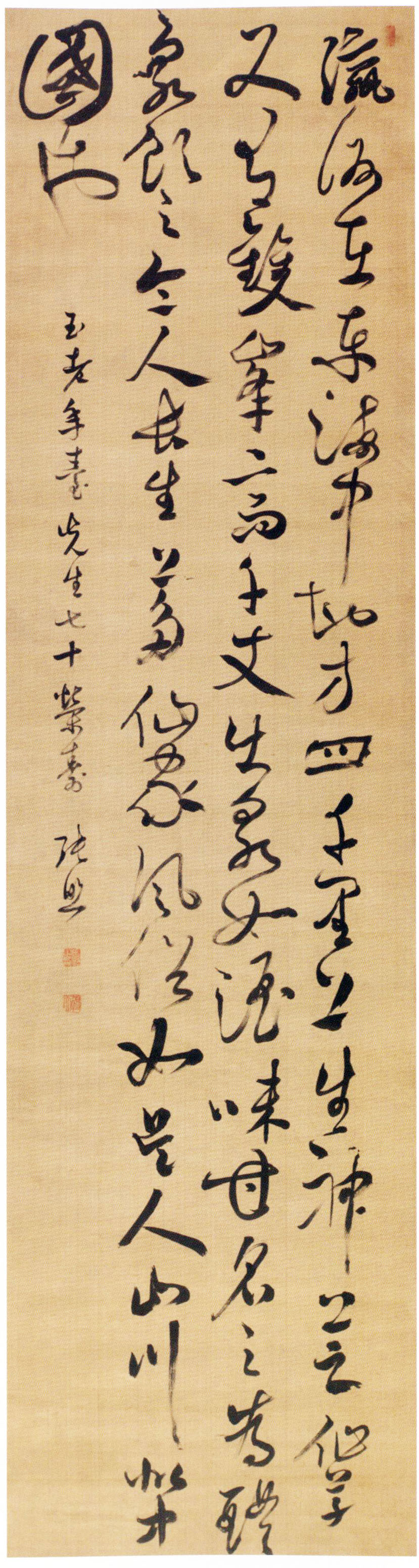 张照《草书节录十洲记轴》绢本草书 178×48cm 天津博物馆藏 释文:瀛洲在东海中,地方四千里,上生神芝仙草。又有双峰高千尺,出泉如酒,味甘,名之为醴泉,饮之令人长生。上多仙家,风俗如吴人,山川似中国也。 款署:玉老年台先生七十荣寿,张照。 钤印:張照之印(白文)、得天(朱文)