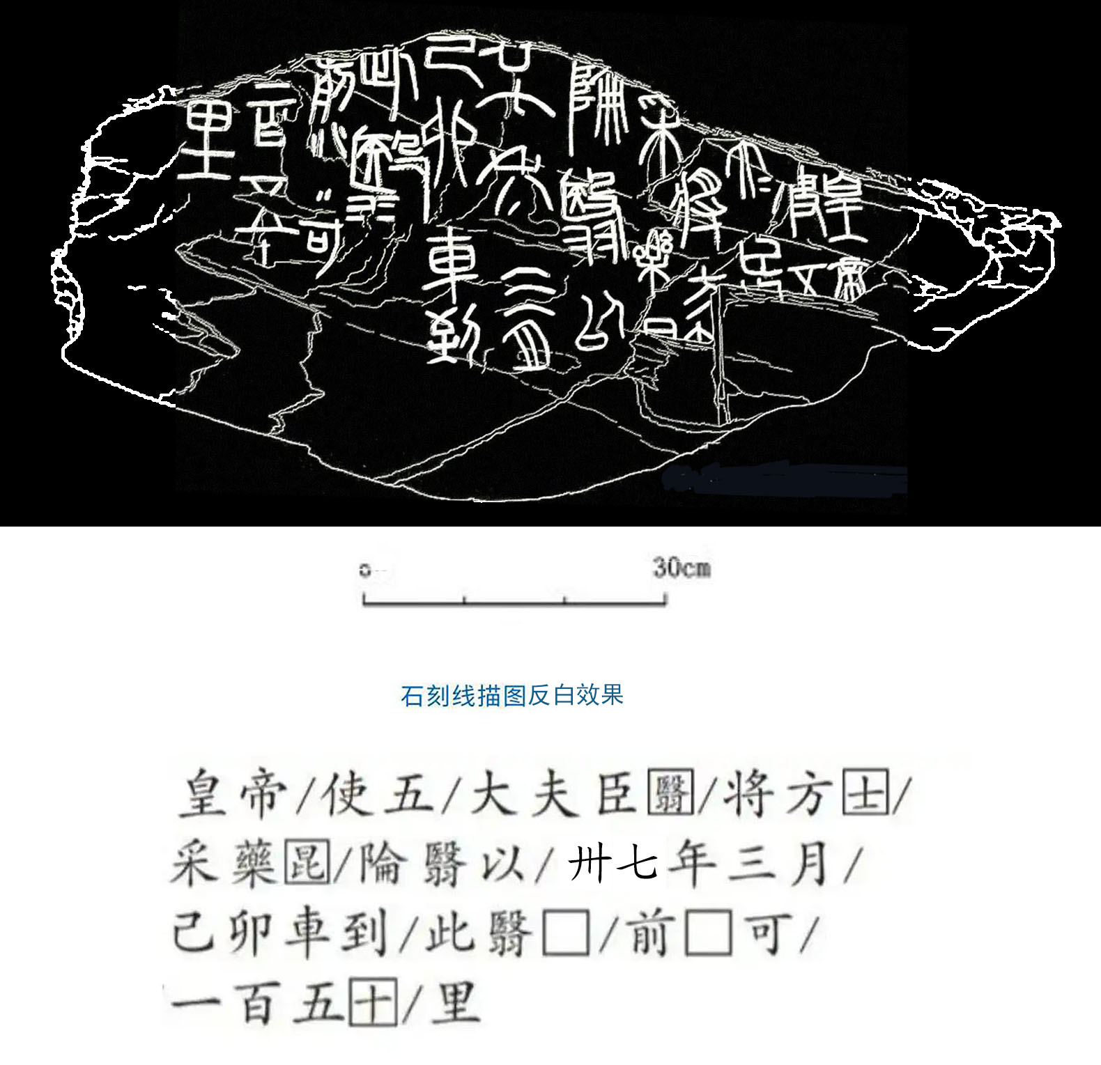 此释文中“廿六”后考证为“卅七”(复旦学者刘钊在《再论昆仑刻石》文中根据最新图片考证,“廿六”是“卅七”的误摹)