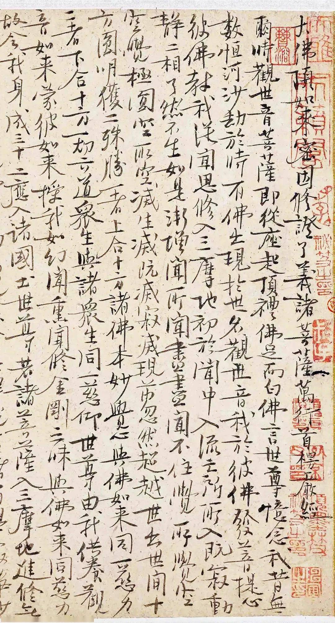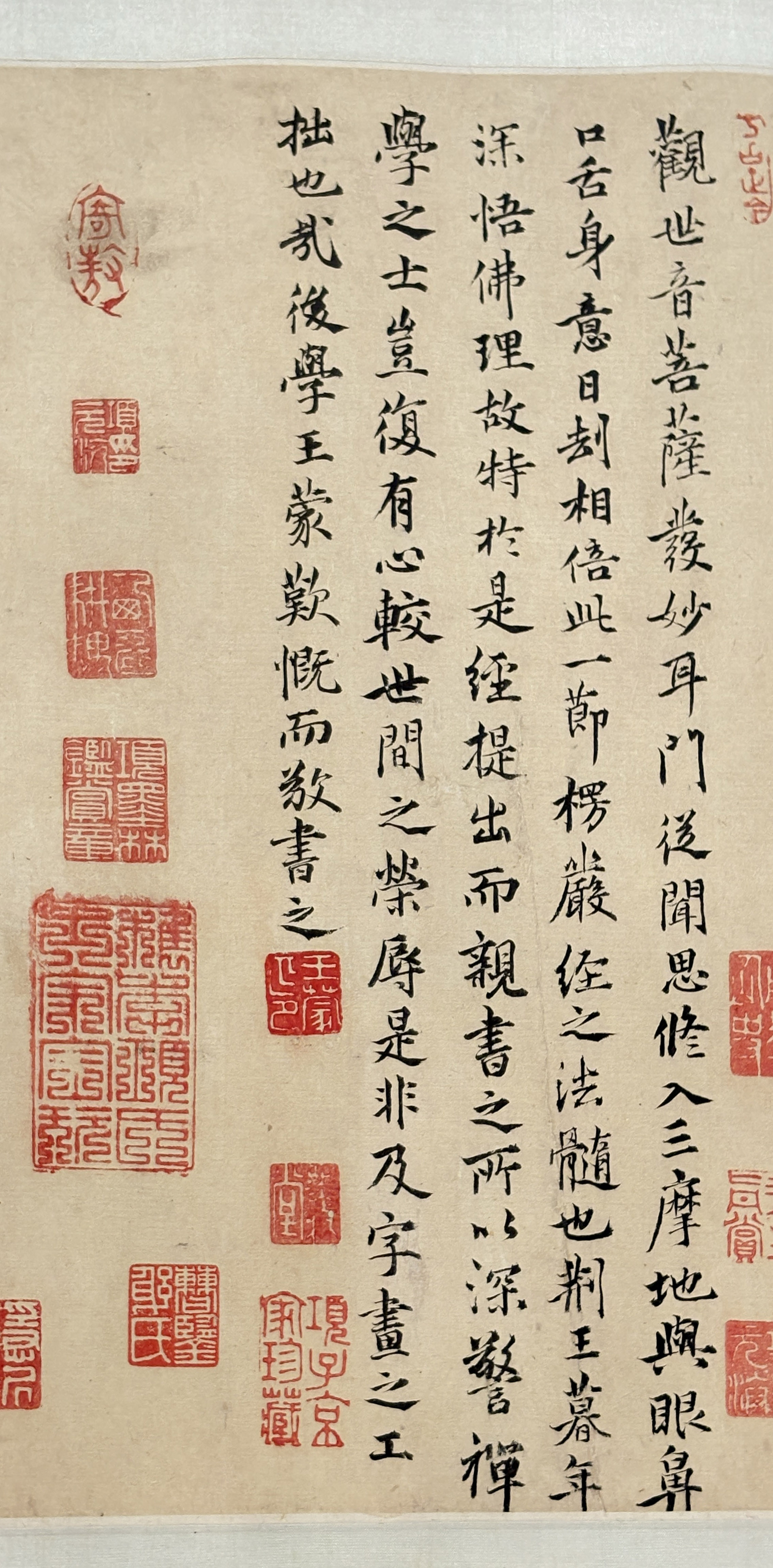 元 王蒙跋:观世音菩萨发妙耳门从闻思修人三摩也,与眼鼻口舌身意日?相倍,此一节楞严经之法髓也。荆王暮年深悟佛理,故特于是经提出而亲书之。所以深警禅学之士,岂复有心较世间之荣辱是非及字画之工拙也哉。后学王蒙叹慨而敬书之。