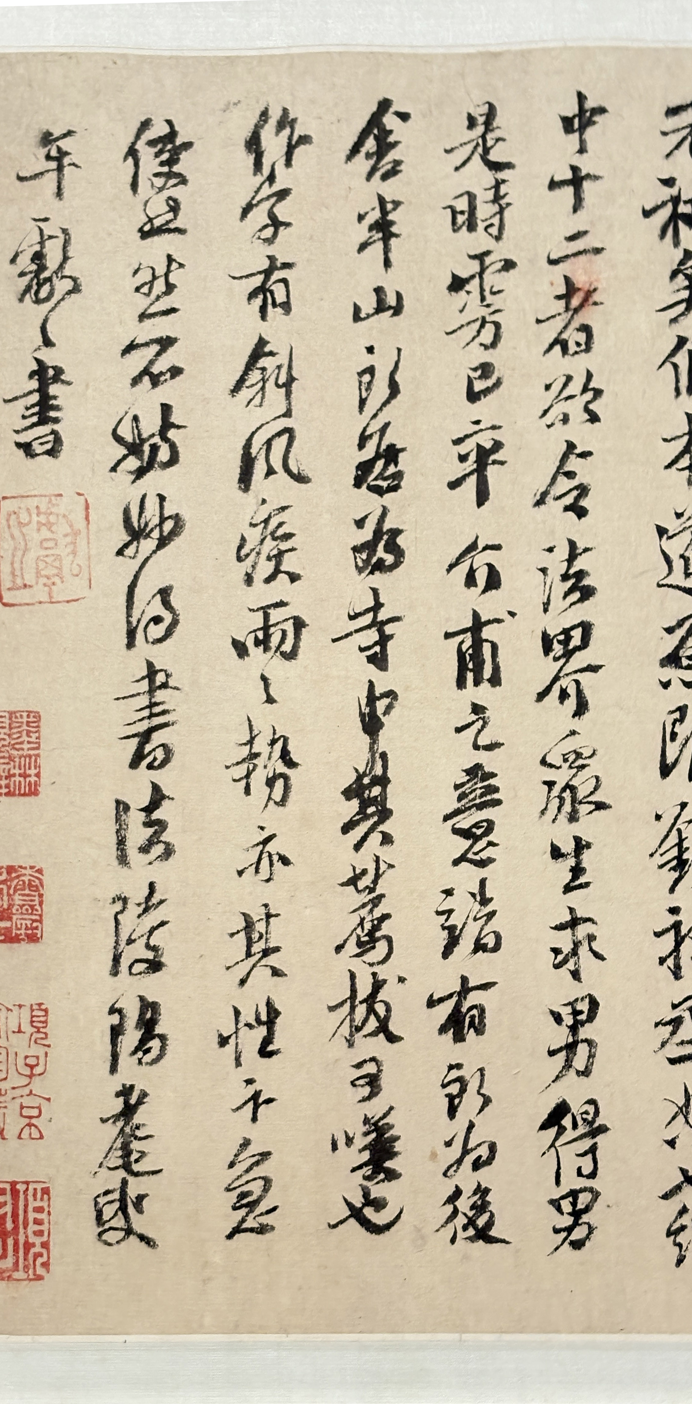 此卷于正书中间有行书,结字修长紧聚。字势于端庄中有奇纵之变,左俯右仰,上下揖让,横笔逸出,孤撇出挑,颇有奇逸之趣。全篇行次紧密,字里行间错落参差,有横雨斜风之势,萧散简远之韵。