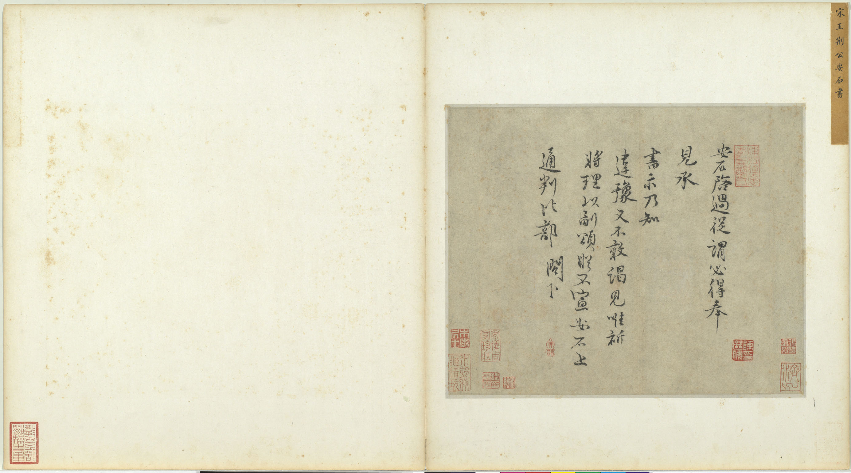 王安石并不以书法名世,但在两宋及其后的资料中,提及王安石书法作品的记载不少。书帖类,如朱熹家藏《安石帖》等;碑刻诗文类,如金陵钟山所立《书定林寺壁》和《半山庄台王文公书》、应天府学所立《此君堂咏竹二首》等;尺牍手札类,如停云馆镌刻《王安石二札》、吴师道跋《安石手书》等;手抄佛经类,如《安石书金刚经》《王安石书楞严经旨要》等;碑刻墓志类,如《书陶隐居墓中文》等。