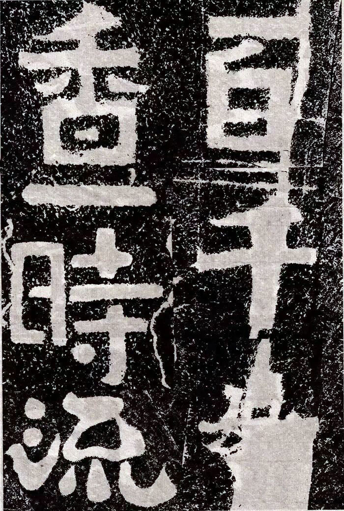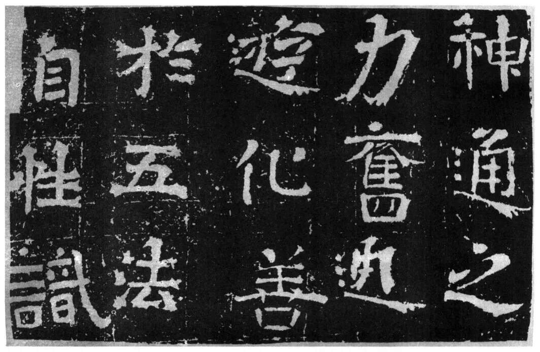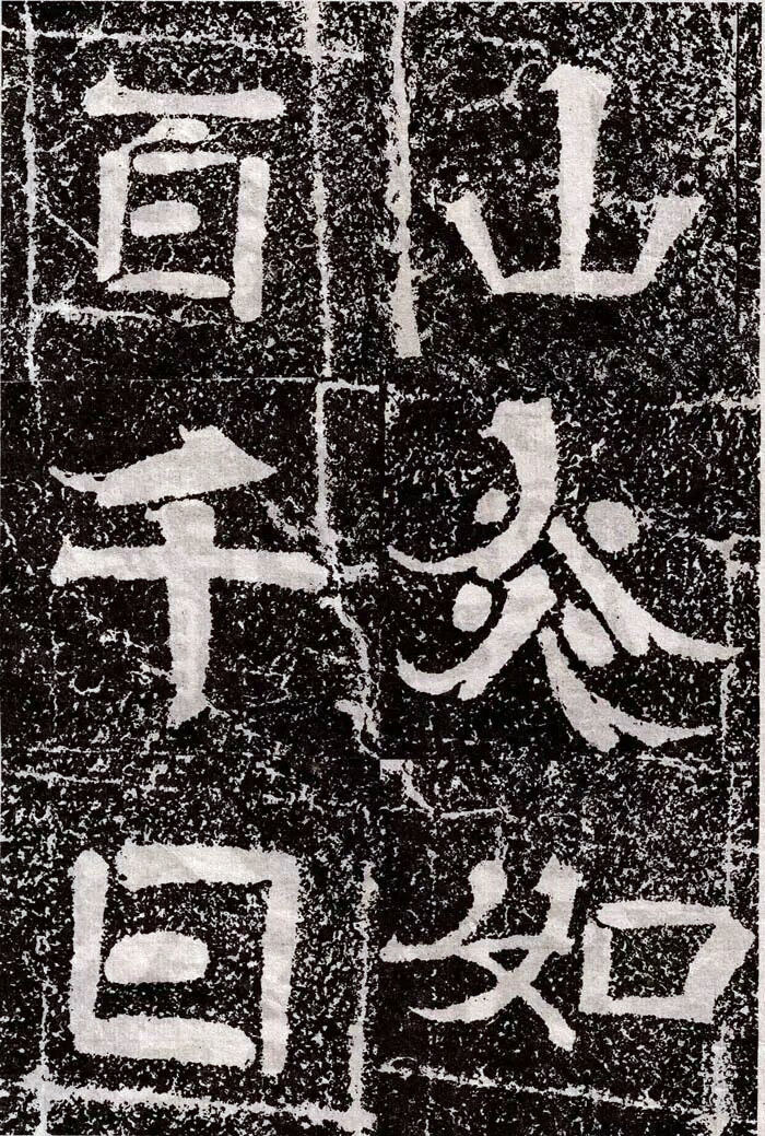 大字《岗山入楞伽经》独具特色,康有为《广艺舟双楫》日:“魏碑大种有三:一日龙门造像,一日云峰刻石,一日冈山、尖山、铁山摩崖,皆数十种同一体者,龙门为方笔之极轨,云峰为圆笔之极轨,二种争盟,可谓极盛。四山摩崖通隶楷、备方圆,高浑简穆,为擘窠之极轨也。”岗山大字佛经皆以隶书结体,用笔上多施楷法,有意识地夸张起笔、收笔处入锋、出锋的效果。点笔皆作圆点,笔画转折处多用断笔,粗犷方峻,稚拙滑稽,乍一看装腔作势,实则是幽默诙谐,别具一番情趣。