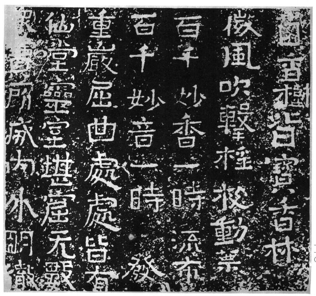 释文: 园香树皆宝香林。微风吹击摇枝动叶,百千妙香一时流布,百千妙音一时俱发。重岩屈曲处处皆有仙堂灵室龛窟。无数众宝所成,内外明澈,