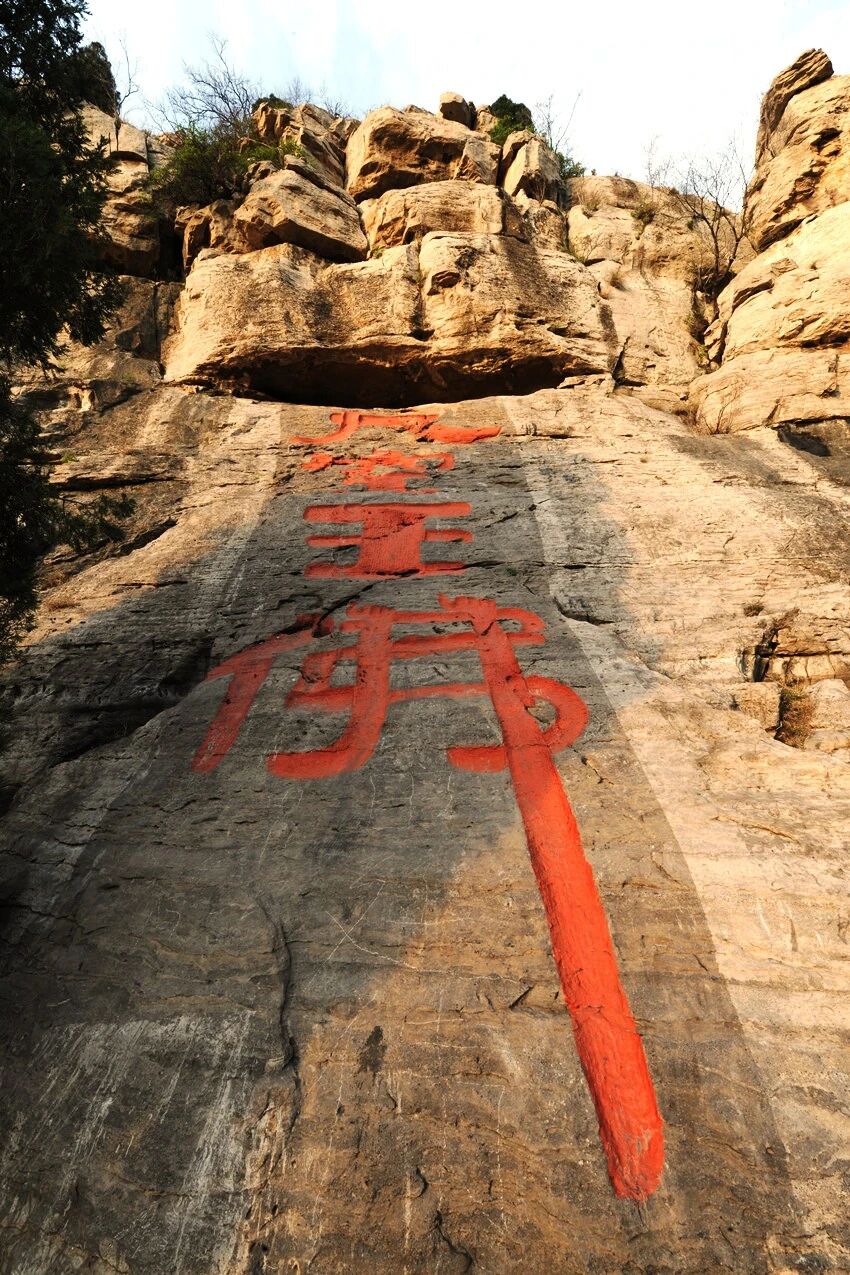 一、为"大空王佛"大字刻石,一竖行四字,字径1.3米左右,隶书。为北朝时期罕见的大字刻石,也是四山摩崖中字径最大者。