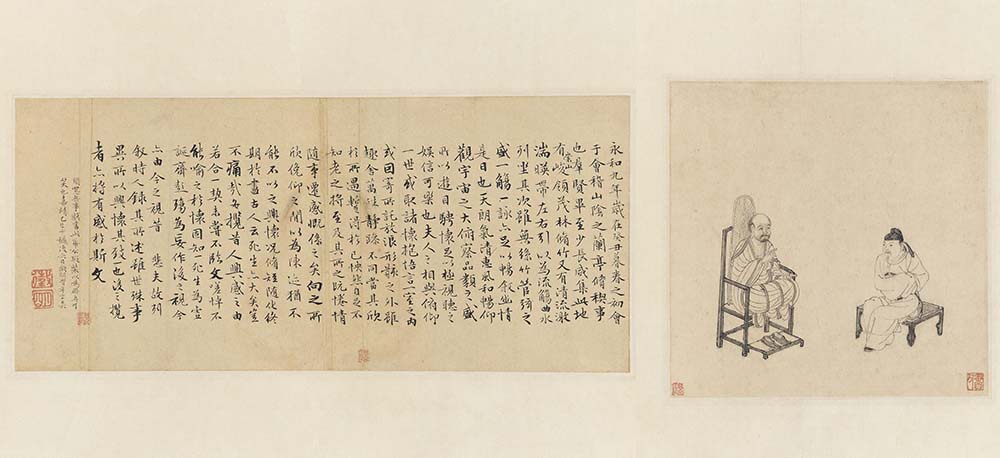 此卷文徵明七十六岁小行楷写兰亭序,仇英画萧翼赚兰亭故事,书画合璧,交相辉映。