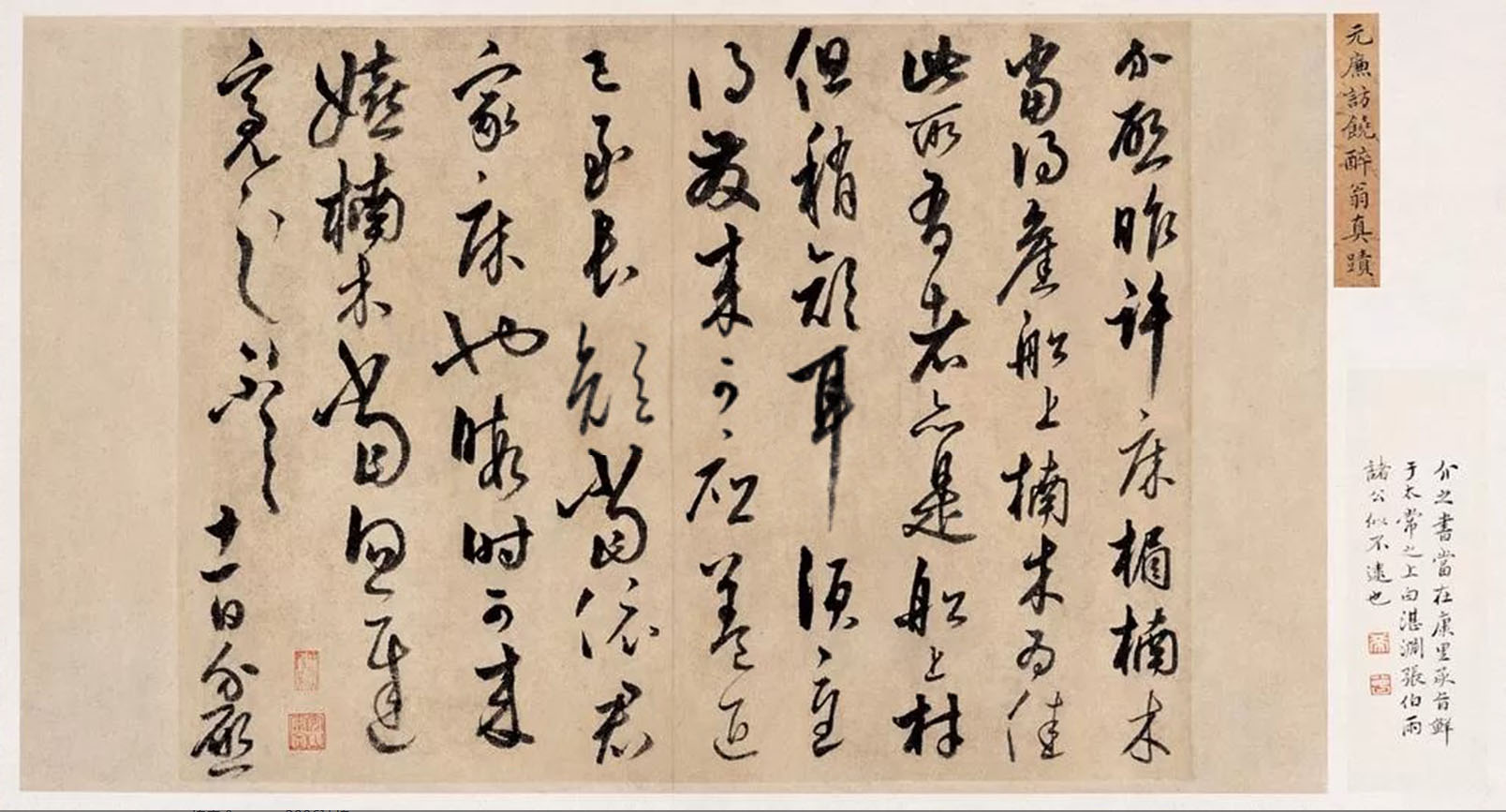 饶介书学康里子山而造羲献之室,故隽朗倜傥,风度自佳,明初宋克等皆师之。《楠木帖》则随意而奔放。是一封短札,写的又是一件小事,但点划遒美,丰筋健骨,字形修短、大小、疏密相间而有画意。豪气奔涌,线条遒逸,随势翻转,流走如丸,节奏很强烈,浓墨枯笔的“耳”字形貌占了几个字位置,而“当”字则左右奔突,势奇形诡,大有怀素之神韵。最后几字,只留下烟云飞舞,“字”已不可辨认。而章草笔意的介入,又增加了线条形态的变化与力量,是一件十分难得的精品。