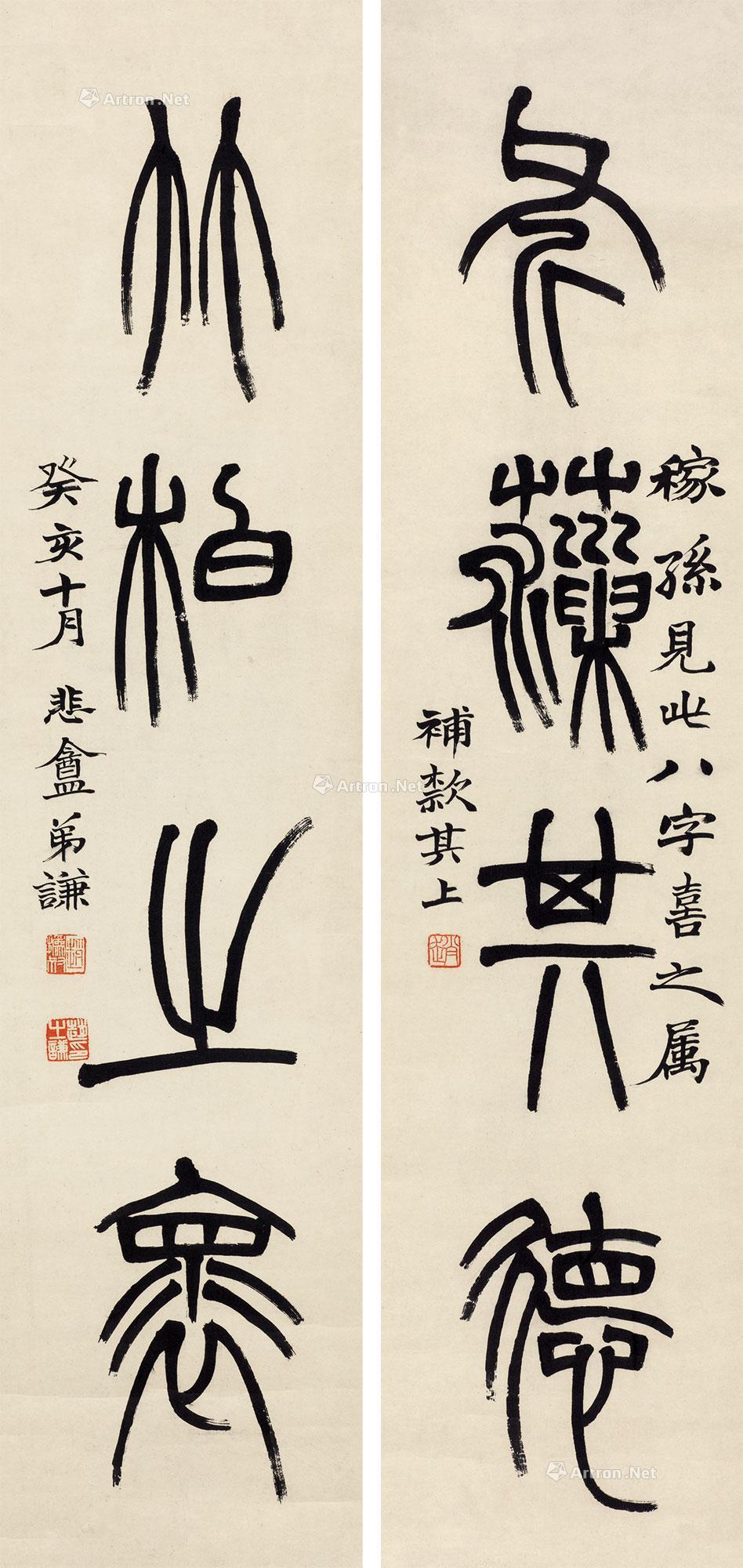 款识:稼孙见此八字喜之,属补款其上。癸亥十月,悲盦弟谦。