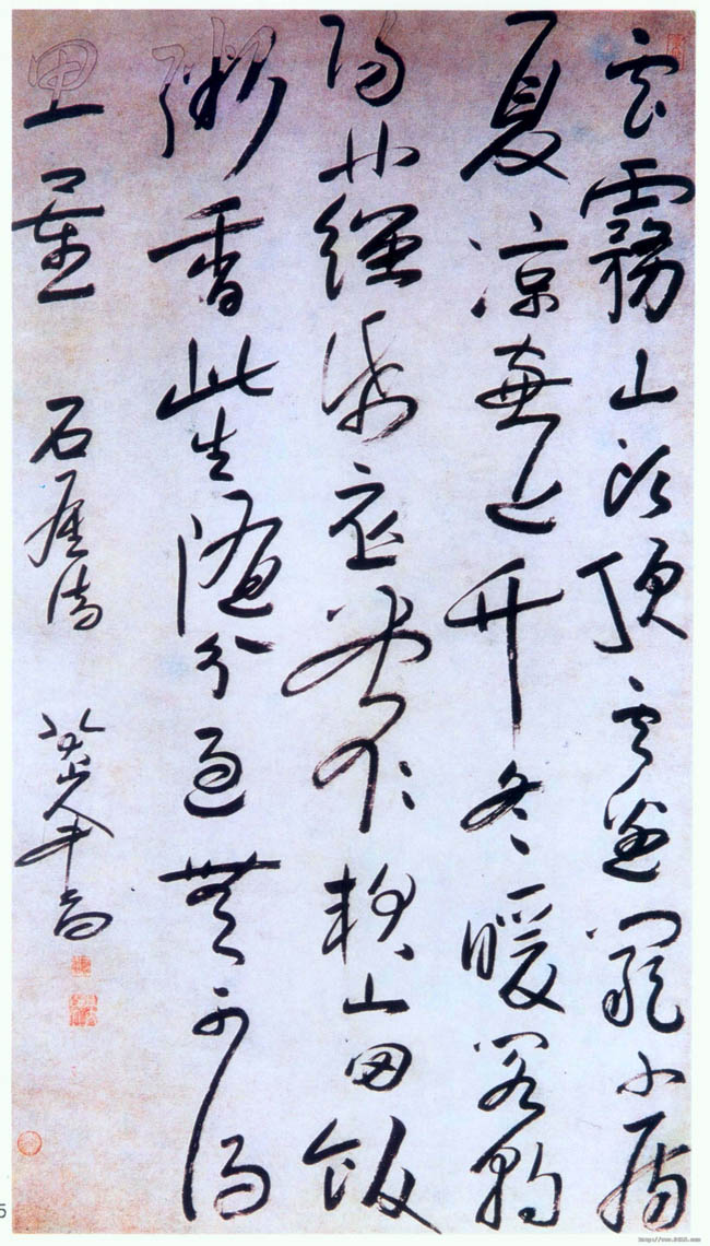 释文:雲雾山头顶。雲边阚小房。夏凉窗近竹。冬暖阁朝阳。茧纸衣裳软。山田饭粥香。此生随分过。无可得思量。 款署:石屋诗。八大山人书。 钤印:可得神仙(白文)、八大山人(白文)