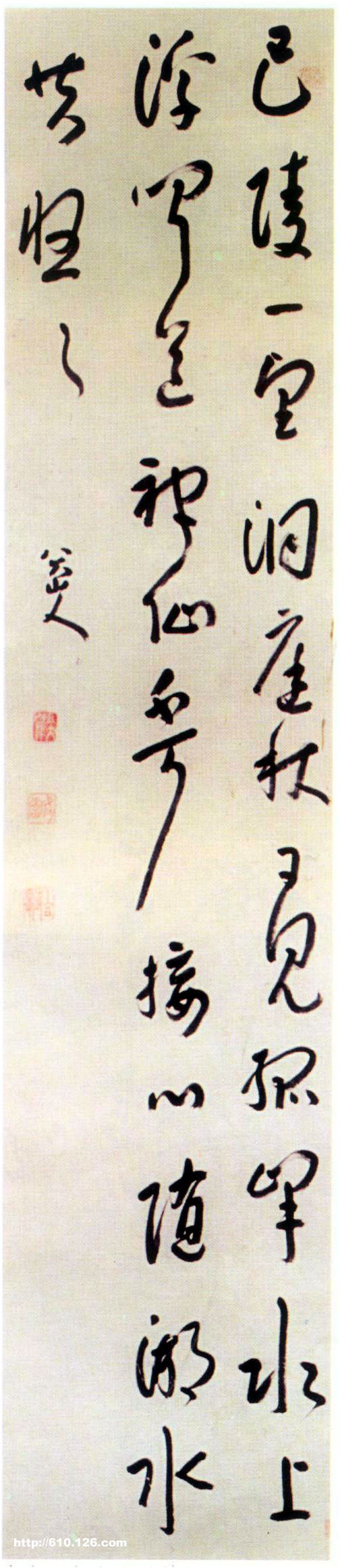 朱耷《草书张说和尹从事懋泛洞庭七绝诗轴》草书 177×45.3cm 北京故宫博物院藏 释文:巴陵一望洞庭秋,日见孤峰水上浮。闻到神仙不可接,心随湖水共悠悠。 款署:八大山人 钤印:八大山人(白文)、何园(朱文) 【资料来源】《中国美术全集》书法篆刻编-6-清代书法(可嘉提供)