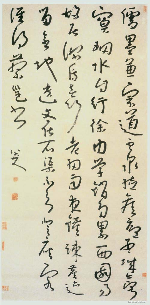 这是一幅八大山人书法中非常精美的草书大立轴。草体有法。但有的字,草法不常见。这首他曾在戊寅三月六日写过一 幅册页。不是草书,是小行惜。存於 旧金山亚洲艺术博物馆,是戊寅年 《山水鱼鸟书法册》中之一页。 此幅幅度大,字体雄伟,笔法圆 润,每字结体稳妥,并且字与字之间 的联系,气度贯通,有些字,把两字 或三字,联接起来,大小错综,混为 一体,如“城今寂”三字,“春竹”二 字,“不知”二字,分合之间,韵律动 人。并且有的字,似畸而正,意断还 联。是书艺之上品,使辨认草字之 间,有似而不似之感,通体笔画、字 形、行气、章法,调和统一,可称杰 作。 这幅立轴,曾在《泰山残石楼藏 画》中印出,是高邕之旧藏。
