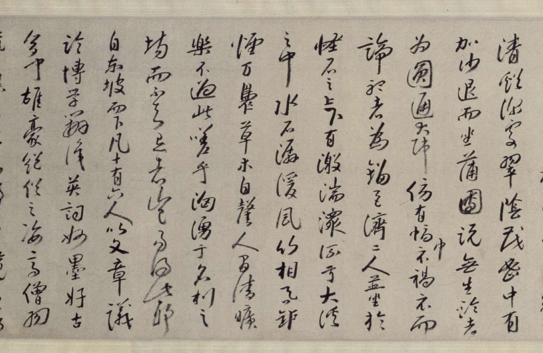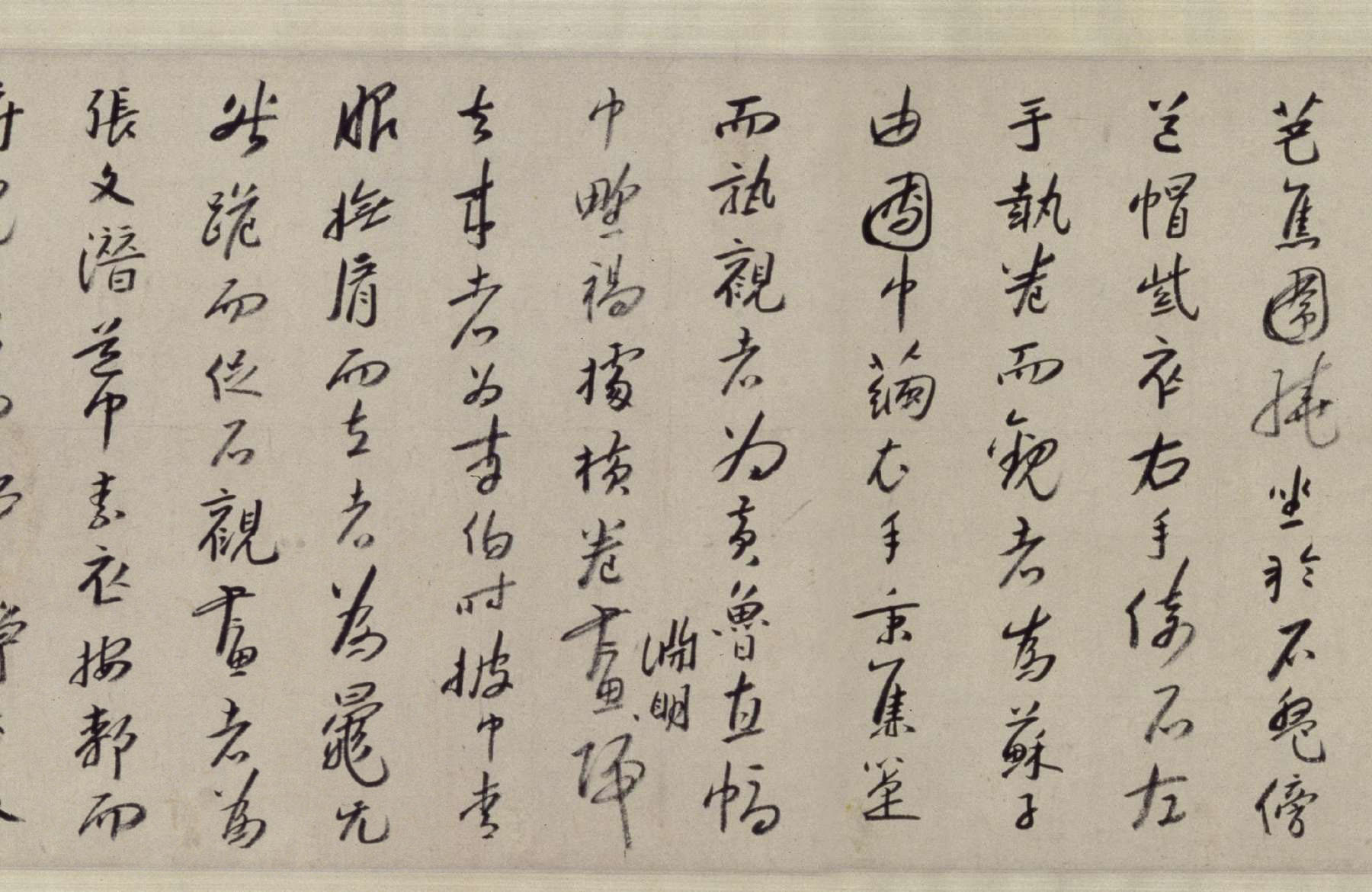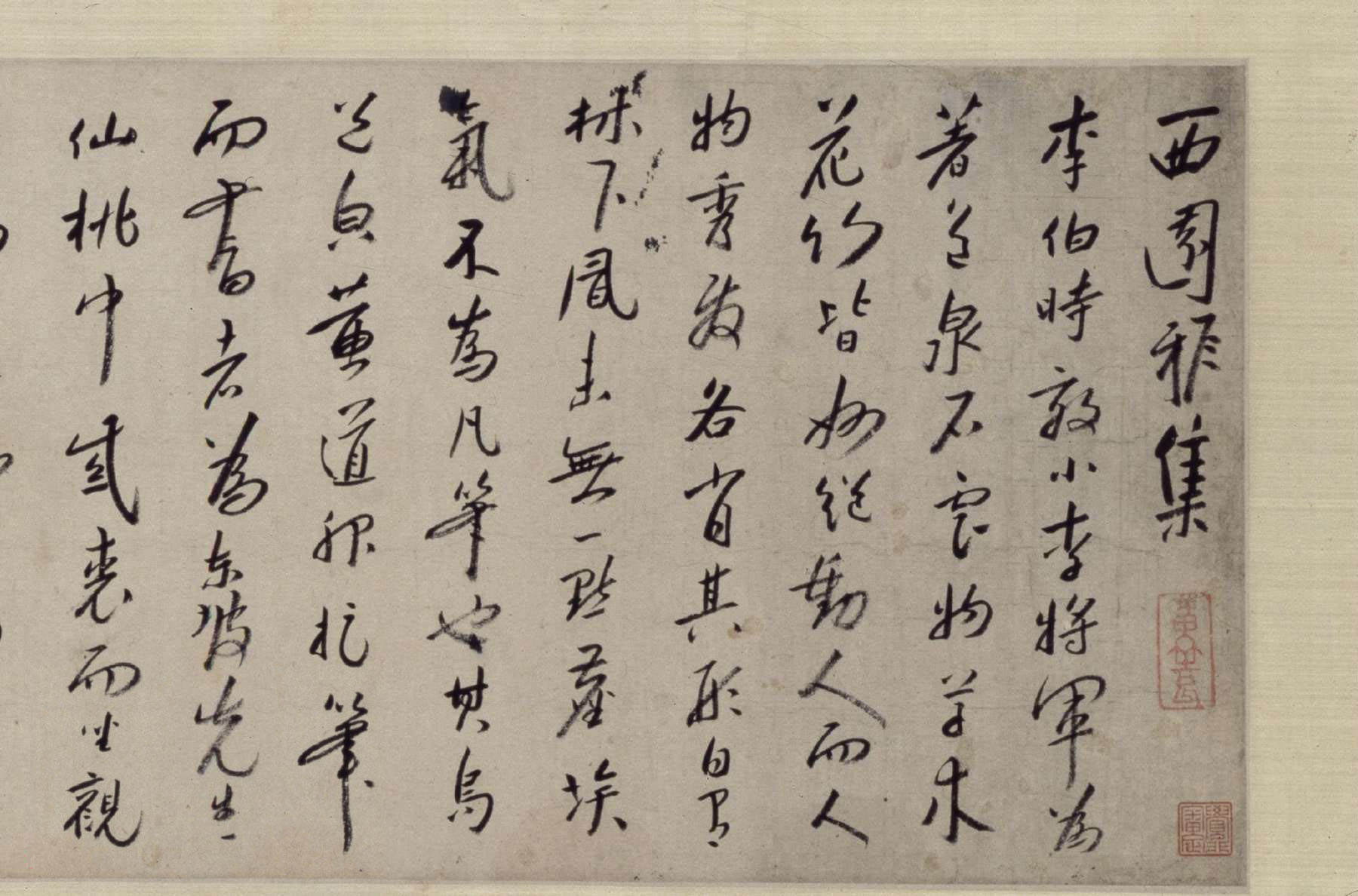西园雅集。李伯时效小李将军为着色泉石云物草木花竹,皆妙绝动人。而人物秀发,各肖其形,自有林下风味,无一点尘埃气,不为凡笔也。其乌道帽黄道服捉笔而书者为东坡先生。仙桃巾紫裘而坐观者为王晋卿。幅巾青衣据方几而凝竚者为丹阳蔡天启。促椅而视者为李端叔。后有女奴,云鬟翠饰,倚立自然,富贵风韵,乃晋卿之家姬也。孤松盘郁,后有凌霄花缠络,红绿相间,下有大石案,陈设古器瑶琴,芭蕉围绕,坐于石盘傍,道帽紫衣,右手倚石,左手执卷而观书者为苏子由。团巾蚕衣,手秉蕉箑而熟视者为黄鲁直。幅巾野褐,据横卷画渊明归去来者为李伯时。披巾青服,抚肩而立者为晁无咎。跪而促石观画者为张文潜。道巾素衣,按静而俯视者为郑静老,后有童子执灵寿杖而立。二人坐于盘根古桧下,幅巾青衣袖手侧听者为秦少游;琴尾冠紫道服摘阮者为陈碧虚。唐巾深衣,昂首而题石者为米元章。袖手而仰观者为王仲至。前有鬅头顽童捧古研而立,后有锦石桥,竹径缭绕于清溪深处,翠阴茂密,中有袈裟退而坐蒲团说无生论者为圆通大师,傍有幅巾褐衣而谛听者为刘巨济,二人并坐于怪石之上,下有激湍潀流于大溪之中,水石潺湲,风竹相吞,炉烟方袅,草木自馨。人间清旷乐不过此。嗟乎!汹涌于名利之场而不知退者岂易得此耶?自东坡而下,凡十有六人,以文章议论、博学辨识、英辞妙墨、好古多闻、雄豪绝俗之姿、高僧羽流之杰,卓然高致。后之揽者,不独图画之可观,亦足仿佛其人耳。