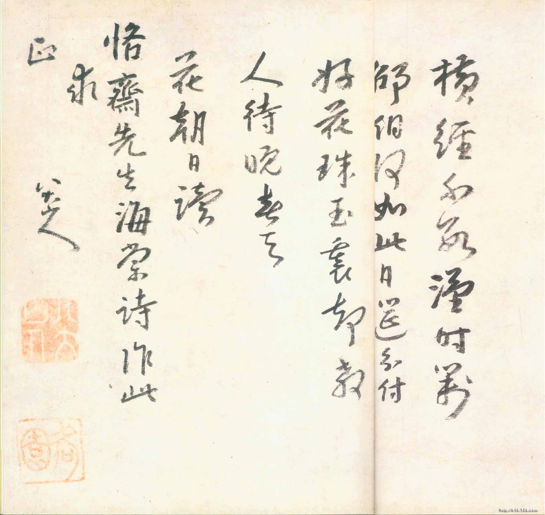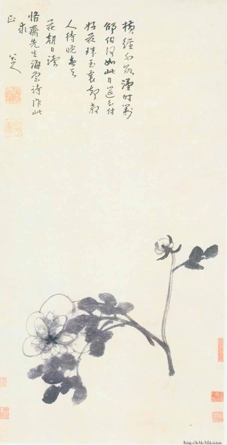 下有『八大山人』白文方印、『何园』朱 文方印;又有张善孖先生藏印一方, 张大千先生藏印四方。 此诗已有数人解释,朱安 群、徐奔二位所著《八大山人诗与画》中,五十一首,解释此诗正确清明,可以参考。但读海棠诗,何以画芍 药?此故事比较屈折,今简记於此: 邵伯,指邵伯湖,在扬州江都 县。朱、徐书注,正确。邵伯湖是因纪念谢安而得名。晋太元十一年谢安官扬州筑新城於城北二十里,筑堰以灌民田,民思其德,比於邵伯,因名邵伯堰。後又有邵伯湖。邵伯见《诗经》《召南》《甘棠序》有『甘棠,美邵伯也气邵伯为人民爱戴。邵伯种的“甘棠”,亦为人民爱护。因此,“邵伯”为人民爱戴官吏之代称。所以人民为感谢谢安,名谢安所建之堰为“邵伯堰”。至於扬州芍药为天下冠,早已为人乐道,八大山人读到海棠 诗,想到“邵伯甘棠”之句,由“邵伯甘棠”联想到“邵伯堰”或“邵伯湖”,又联想到谢安在扬州,由扬州想到芍 药。所以看了海棠诗,而画出芍药。
