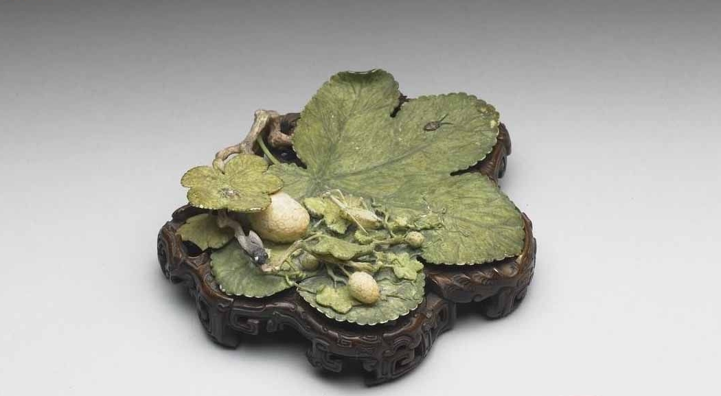 象牙雕葫芦形笔掭,清,高1.6cm,最长17.8cm,最宽13cm。清宫旧藏。笔掭为浅缘盘,葫芦式。盘上浮雕并镂雕葫芦枝蔓、叶片及小葫芦为饰,并蜿蜒于盘侧及底部,又伸入盘内,增添了器型的变化。盘仿葫芦形的束腰处则浮雕一蝙蝠。 |
