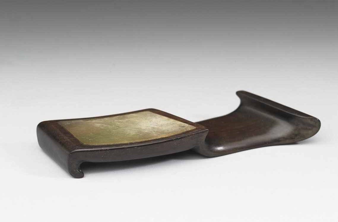 明 紫檀木镶玉墨床 台北故宫博物院藏尺寸:13.0x3.8x1.3 公分 质材:玉石玉石 典藏号: 赠玉000249N000000000 说明:紫檀木镶玉墨床,内嵌青玉片,玉色泛黄,并有大片白綹。全器似一摊开之书卷,作两页面,一侧高一侧低,玉片嵌於一侧较高的书页上。