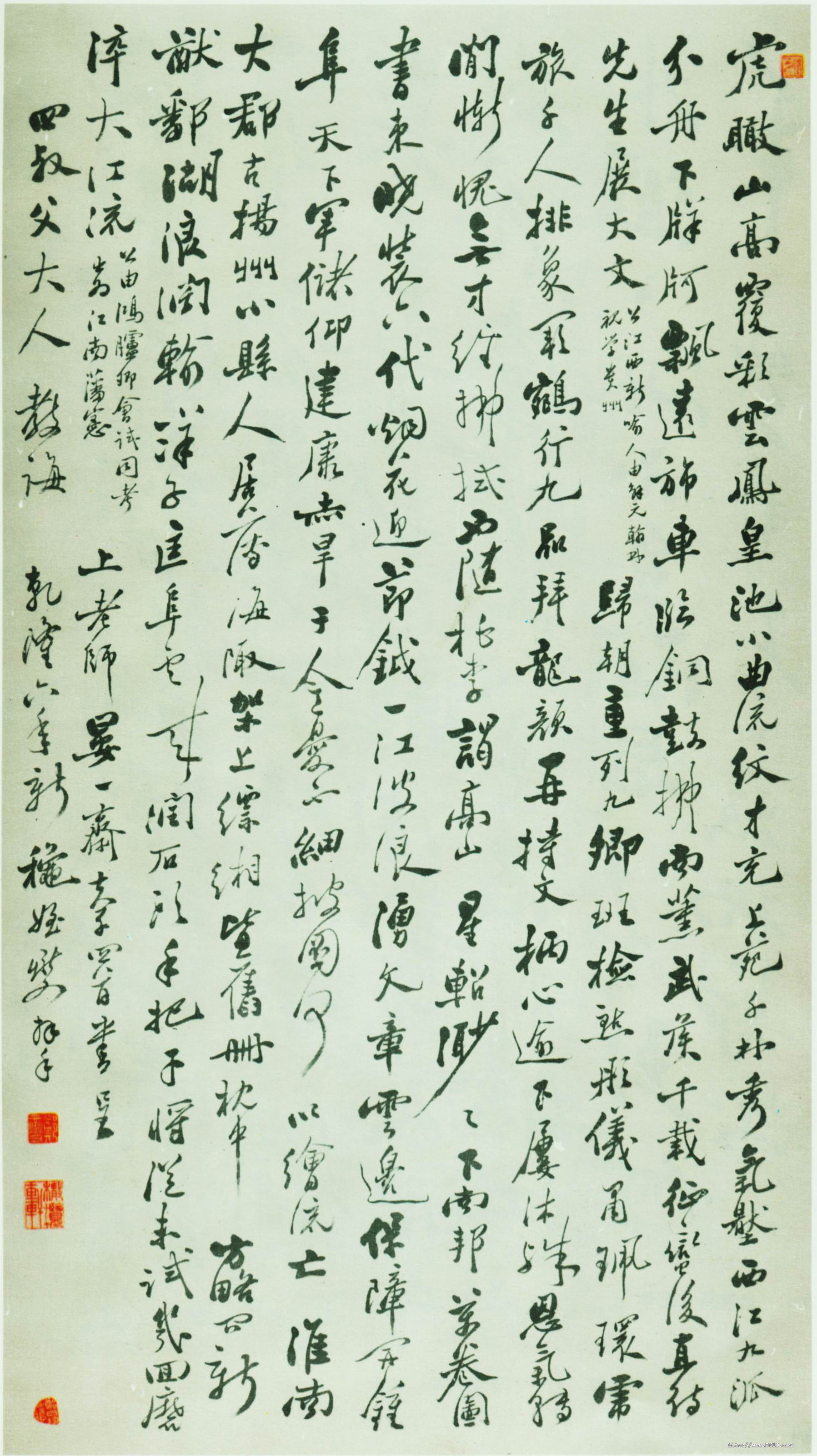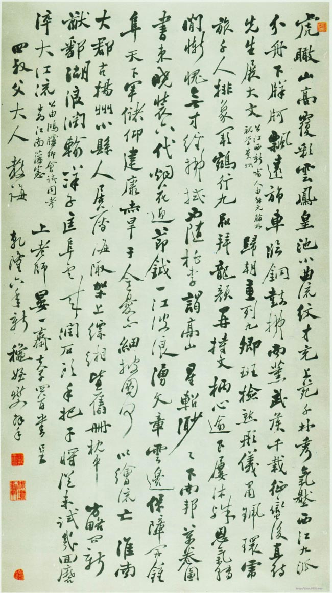 释文:虎瞰山高覆彩云,鳯皇池小曲流纹。才充上苑千林秀,气压西江九派分。舟下牂牁飘逺斾,车临铜鼓拂南熏。武侯千载征蛮后,直待先生展大文。(公江西新喻人,由解元翰林视学贵州)