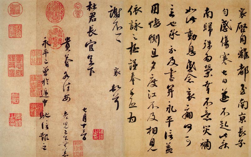 襄啟。自离都至南京。长子匀感伤寒七日。遂不起此疾。南归殊為荣幸。不意灾祸如此。动息感念。哀痛何可言也。承示及书。并永平信。益用悽惻。旦夕渡江。不及相见。依咏之极。谨奉手啟為谢。不一一。襄顿首。杜君长官足下。七月十三日。贵眷各佳安。老儿已下无恙。永平已曾於递中。驰信报之。