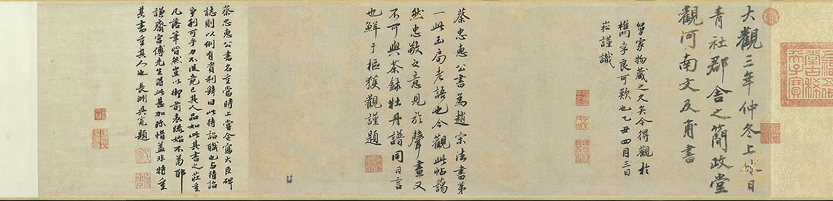题跋三:蔡忠惠公书。為赵宋法书第一。此玉局老语也。今观此帖。蔼然忠敬之意。见於声画。又不可与茶录牡丹谱同日言也。鲜于枢获观谨题。