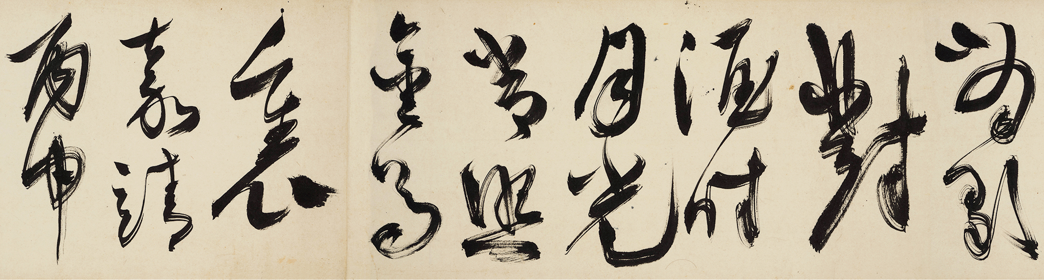 第三段,以大草书书李白《把酒问月·故人贾淳令予问之》并识其后曰:“嘉靖丙申,余于武林之游,仲夏扬船,经二月且未反棹。今日宿虎跑寺,已值中秋矣!举酒对月,答我踈狂。客复有歌李翰林把酒问月之章,遂因其歌而书之,以志一时之兴,竟不知今夜故乡风景复何如也!白阳山人陈道复。”可知,他在中秋之夜客居虎跑寺时,与客把酒对月,酒酣兴至,闻歌书此,这是微醺疏狂中的书迹。落笔之始似不经意,“青天有月”四字尚未完全进入状态。往后,速度渐快,至“我今停杯”已见狠笔,接着便放笔直下,任其驰骋,欹侧变化,无须思索,笔锋散聚亦所不顾。至“共看明月”,已入狂态,“当歌对酒”更形成高潮,其恣肆纵放之态显露无遗。他忽又想到了家乡:“不知今夜故乡风景复何如也!”这种突如其来的转折,在故宫博物院所藏白阳《墨花钓艇图卷》中曾有表现,该卷共画十段,前九段皆写折枝花木,第十段竟作寒江钓艇,殊有不相协调之感,而其作跋云:“余留城南凡数日,雪中戏作墨花数种。忽有湖上之兴,乃以钓艇续之,须知同归于幻耳!”原来这是他作画过程中的心理变化,反映着作者令人称快的真性情。而在酒酣兴浓之时,突然想到了家乡,这就是性情坦露的陈白阳!陈道复的书法,自其师文徵明上溯唐人颜真卿、宋人米芾、黄庭坚,崇尚个人情感意志的抒发,使硬毫健笔,提按纵横,宽博取势,形成豪雄自由的风格气象。其大草书,有出蓝之誉,超越了文徵明与祝允明。