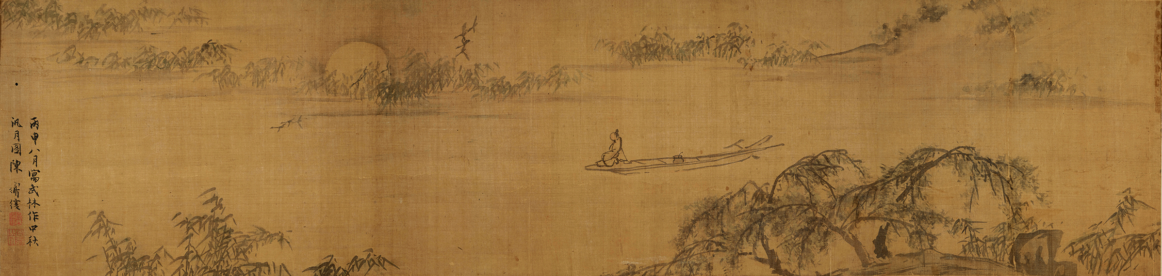 此卷共三段,第一段引首,作大行书“越游纪胜”四字,率意中见沉着,风骨棱棱,落款“道复书”。第二段,画月圆江上独泛舟,前景作坡石、野柳、芦苇;中景仅一舟一人,寥寥数笔勾画而成;后景写芦苇堤岸与夸大的圆月,一行大雁穿飞而过……全图纯用淡墨分层次写成,微施淡赭、淡青,简洁空灵,月夜朦胧、冷寂、清幽之境跃然素绢之上。观者当会诘问,孤舟独坐者谁?除了作者,还会是别人吗?独坐赏月,又何尝不是作者真性情的写照。画末署款:“丙申八月寓武林,作中秋汎月图,陈道复”。丙申为明嘉靖十五年,纪元1536年,作者五十四岁,乃其盛年。武林即杭州。