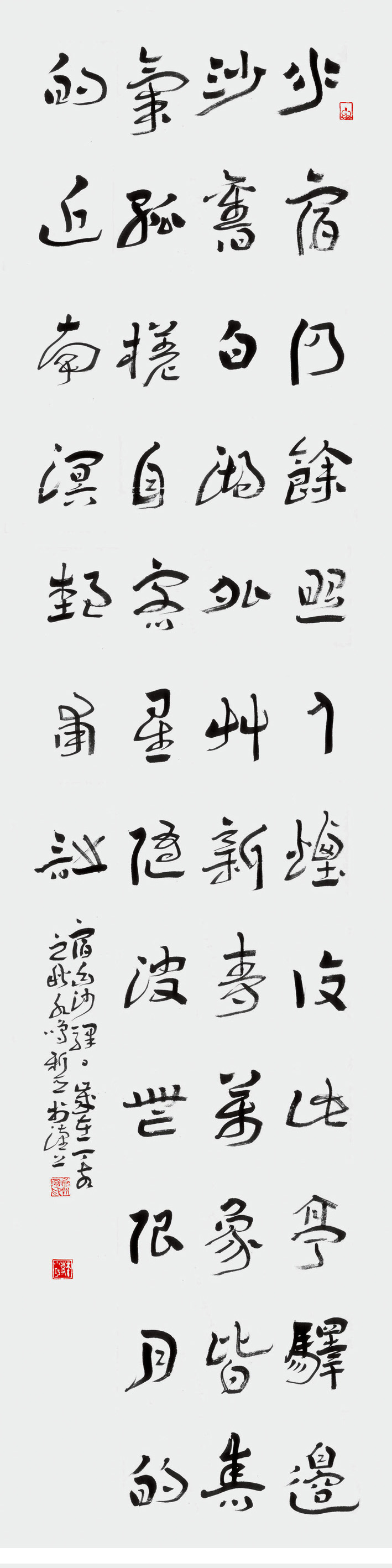 释文: 水宿仍余照,人烟复此亭。 驿边沙旧白,湖外草新青。 万象皆春气,孤槎自客星。 随波无限月,的的近南溟。 杜甫诗《宿白沙驿》。岁在丁亥之秋。水鸣新亚于汉上