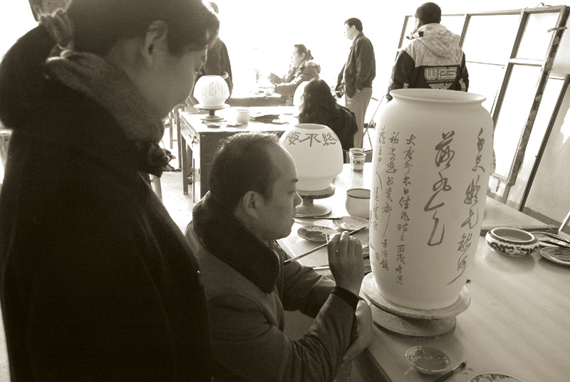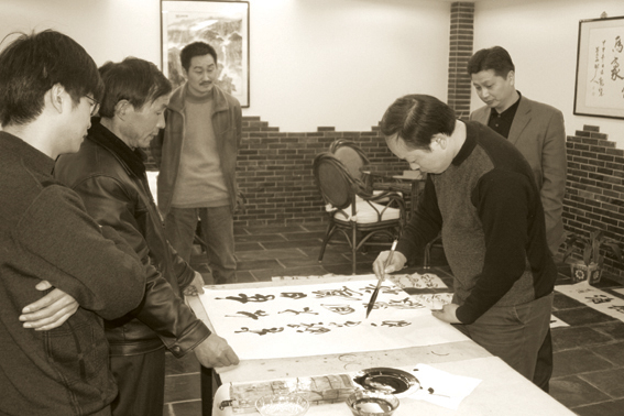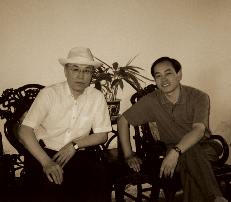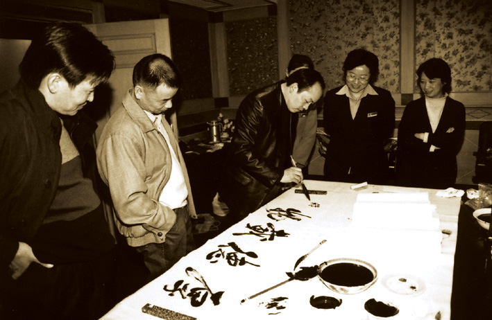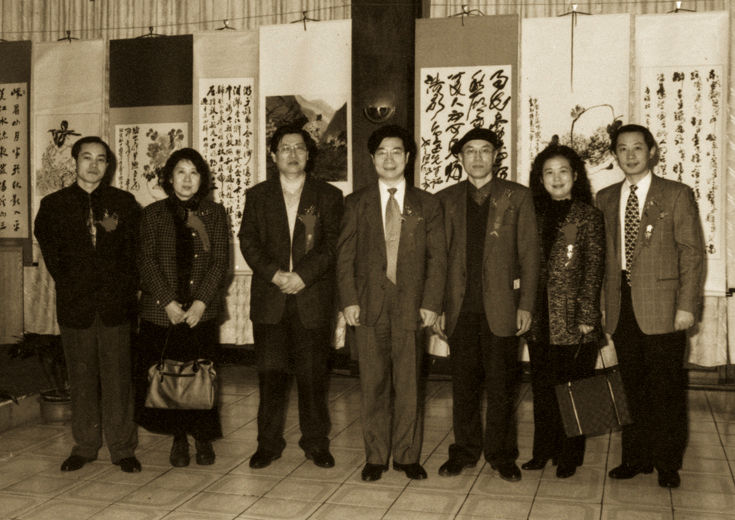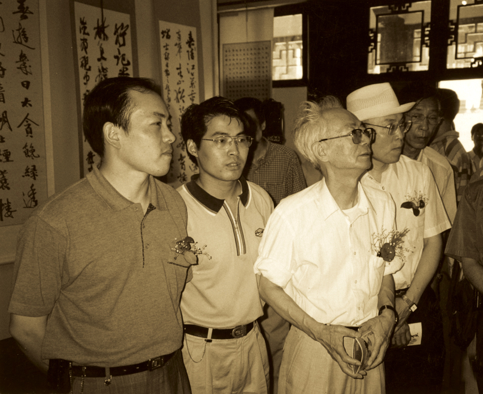 应特别邀请,中国文联副主席、中国书法家协会主席沈鹏先生(前排中)与前中央美院副院长、《美术》杂志社社长叶毓中教授(前排右)出席了2000年6月在南京江浦县“林散之纪念馆”举办的“当代百家书林散之诗作展”开幕式。图为何道宽(前排左)陪同二位前辈参观展览作品。