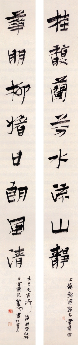 刘一闻此联横画略粗,一反常态,借鉴了金农隶书的写法,横向刷笔,点画的用笔干净利落而绝无粘滞之感。同时他在横直笔画间摻入了一些弧形笔画来加以变化,显得特别有味道,结字上也有自己的特点,有的字的造型和笔画该长不长,该短不短,特别富有篆刻性的装饰意味。还有就是落款的虚实和穿插也是其中的特点之一。应该说是难得的佳作。