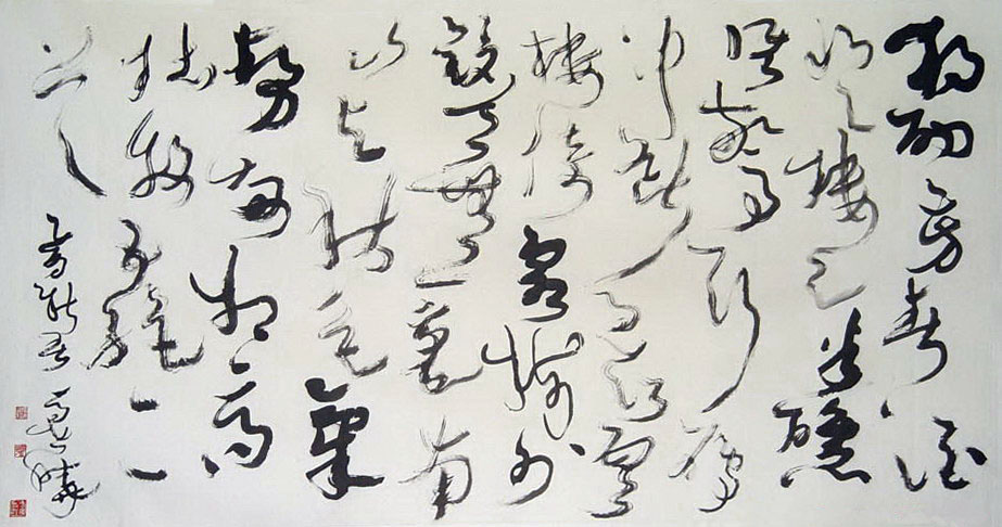 马世晓《草书横幅杜牧五绝二首》 【释文】独酌芳春酒,登楼已半醺。谁惊一行雁,冲断过江云?楼倚霜树外,镜天无一毫。南山与秋色,气势两相高。杜牧五绝二首。乙酉新春,马世晓。