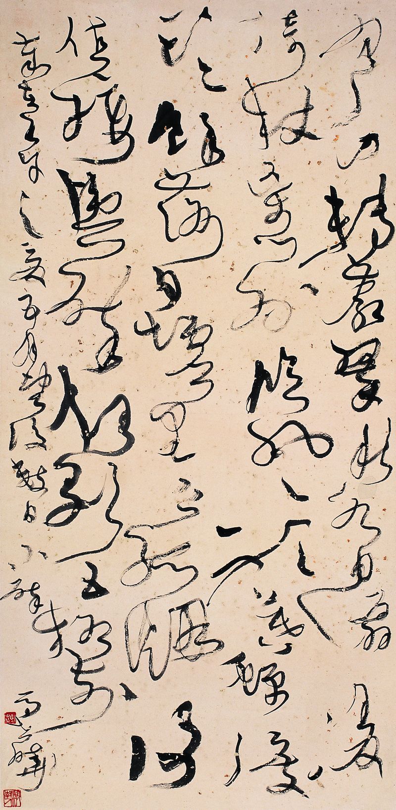 马世晓 《王维辋川闲居赠裴秀才迪大草轴》 132cm×66cm 【释文】 寒山转苍翠,秋水日潺湲,倚杖柴门外,临风听暮蝉。渡头余落日,墟里上孤烟。复值接舆醉,狂歌五柳前。岁在壬午之夏,五月望后数日,小醉,马世晓。
