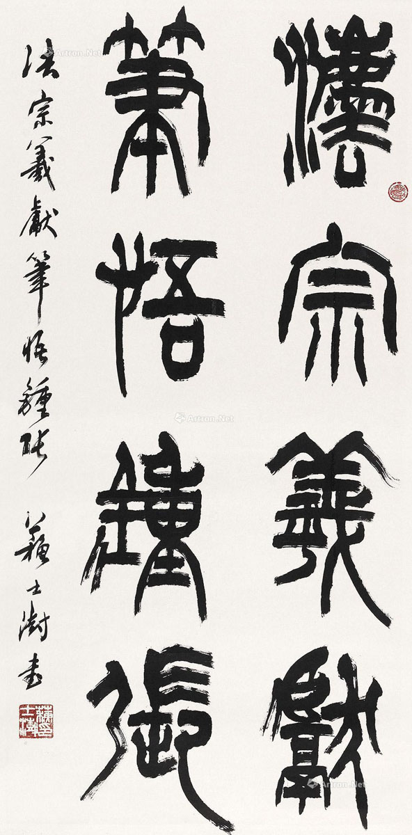 苏士澍《篆书四言联》 125×60cm 北京荣宝拍卖拍卖会 释文:法宗羲献,笔悟锺张。苏士澍书。