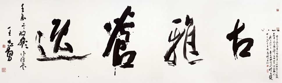 创作手记:榜书大字难于厚重处见轻松、泼辣中见灵动,故历代书家中擅此者鲜矣。余此作盖在游玩途中所得。时今岁夏尾,余应廖兄炳训相邀,过珠海小驻。饭后几位书友品茶染翰,颇得书斋之乐。余一时兴起,捡三支毛颖拢于手中,就案上铺好之丈二大纸,信笔挥洒, 顷刻而成。悬壁观之,众人皆以为不恶。今思其因,乃无意于书之故也。