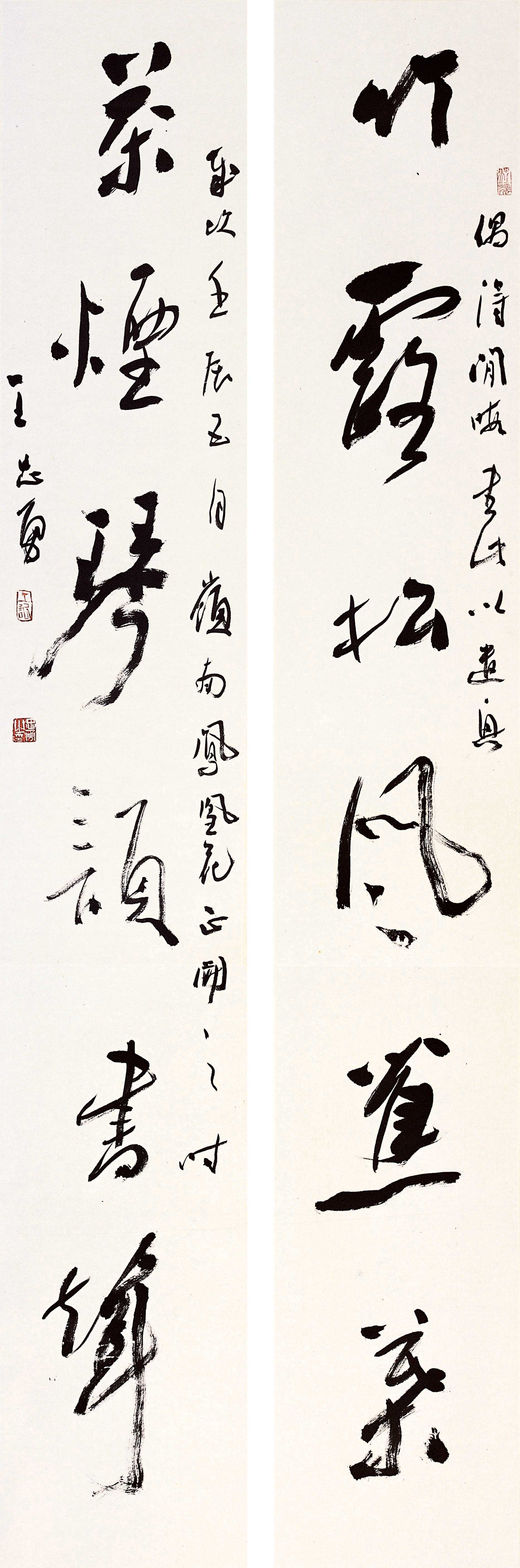 正因为有这种特殊情结,在各种书法形式中,我最贯写的便是对联。是联散淡从容,暗合词意,不经意处仿佛游走着一缕清气。