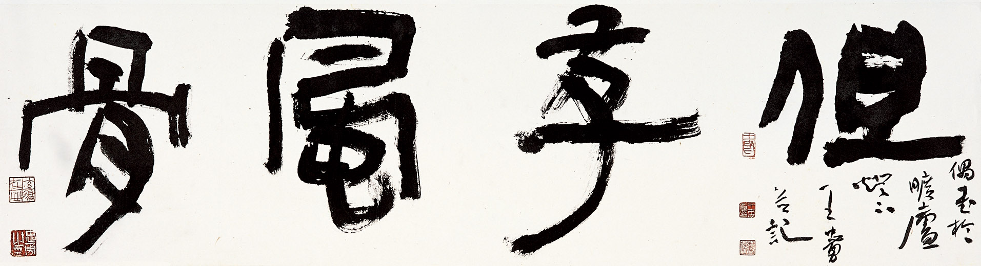 王忠勇 《但存风骨》横批 作品尺寸:34cm×138cm 作品释文:但存风骨 创作手记:意在西汉,非篆非隶,亦篆亦隶,且不论也,但求高古之气。 书写材料:狼毫、李廷珪油烟墨、生宣 印 章:王郎、王忠勇印、无逸、玄微在心、忠勇印信