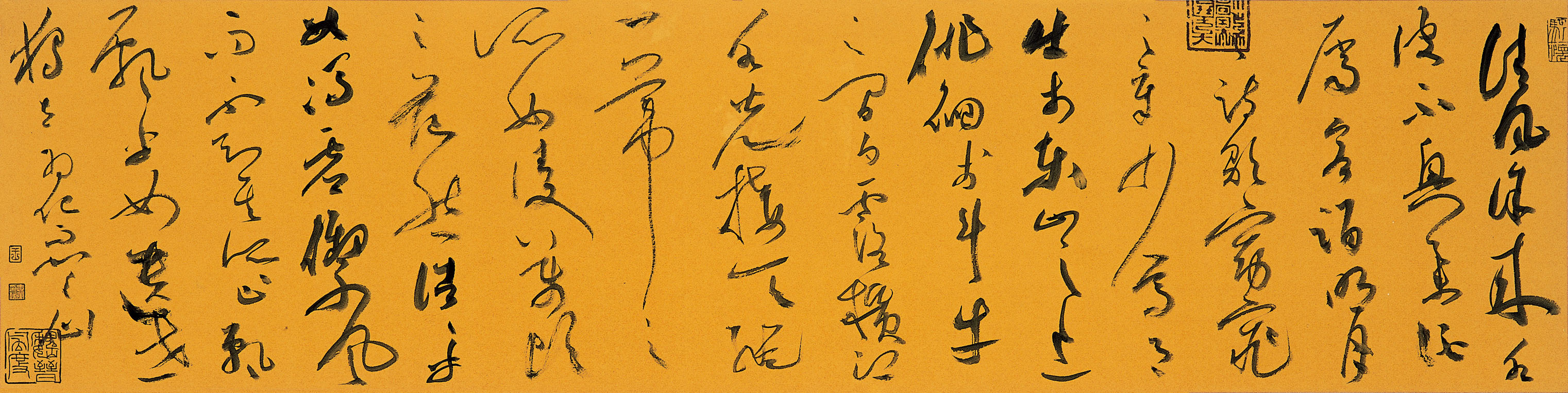 王忠勇 苏轼《前赤壁赋》一节 作品尺寸:34cm×138cm 作品释文:清风徐来,水波不兴。举酒属客,诵明月之诗,歌窈窕之章。少焉,月出于东山之上,徘徊于斗牛之间。白露横江,水光接天。纵一苇之所如,凌万顷之茫然。浩浩乎如冯虚御风,而不知其所止;飘飘乎如遗世独立,羽化而登仙。 创作手记:是作借东坡《赤壁赋》文意生发,笔下仿佛有“凌万顷之茫然”之意境。稍掺宿墨,更觉带燥方润之趣。 书写材料:狼毫、李廷珪油烟墨、仿古宣 印 章:骋怀、古印、王、忠勇印信、魏晋风度