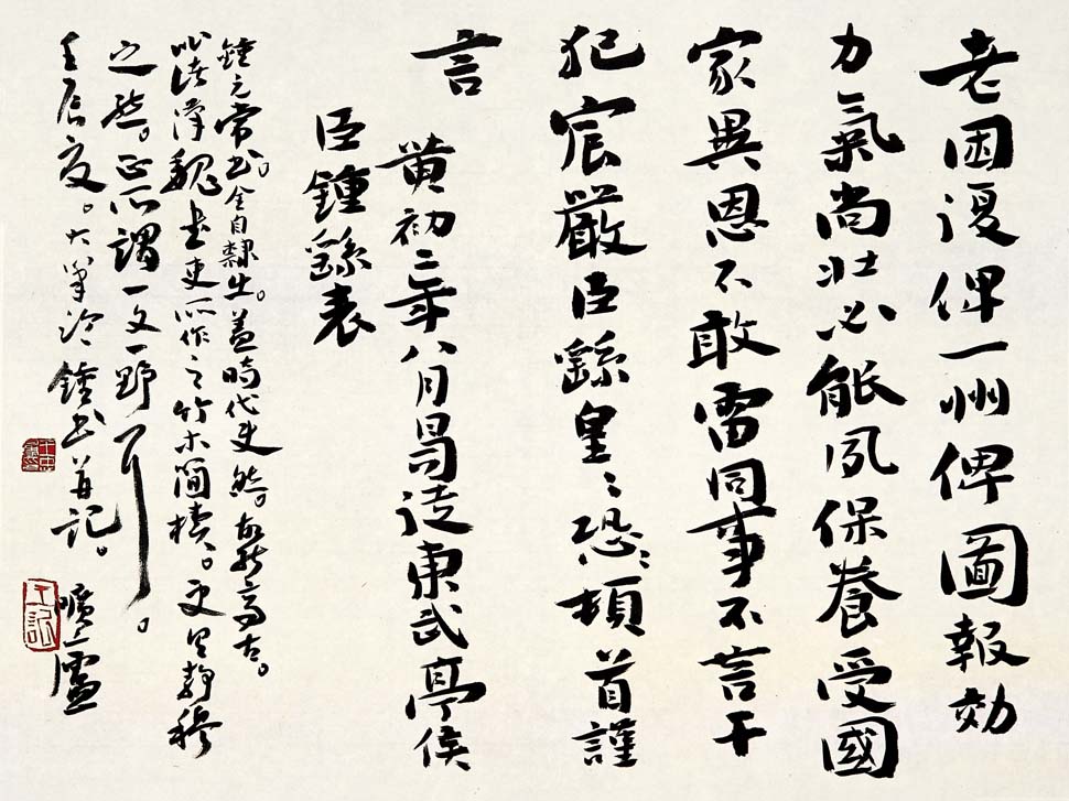 王忠勇 临钟繇《荐季直表》 作品尺寸:66cm×50cm 作品释文:略 创作手记:钟元常书,全自隶出。盖时代使然,故能高古。比诸汉魏书吏所作之竹木简牍,更具静穆之态。正所谓一文一野耳。 书写材料:狼毫、李廷珪油烟墨、熟宣 印 章:王忠勇印、王记