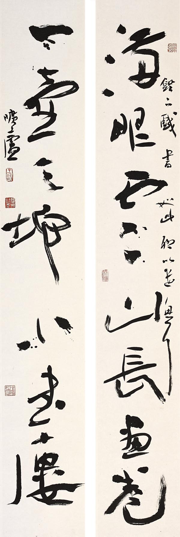 王忠勇 《满眼一壶七言联》 作品尺寸:35cm×180cm×2 作品释文:满眼云山长画卷,一壶天地小书楼 创作手记:是作当属古人所谓之“破体”者。若行,若草,若隶,若篆,随势而生发之,诸体杂糅,但求自然。偶而为之,可谓戏作耳。 书写材料:兼毫、李廷珪油烟墨、仿古宣 印 章:延年、骋怀、长乐无极、王忠勇印