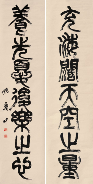 篆书充海养先七言联 180×45cm×2 1992年 释文:充海阔天空之量,养先忧后乐之心。 来自《姚奠中书法展》 中国美术馆 2006.08.25 至 2006.09.02