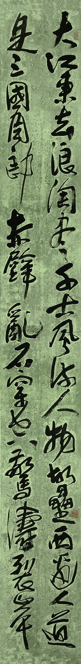 释文:大江东去,浪淘尽,千古风流人物。故垒西边,人道是,三国周郎赤壁。乱石穿空,惊涛拍岸,卷起千堆雪。江山如画,一时多少豪杰。 遥想公瑾当年,小乔初嫁了,雄姿英发。羽扇纶巾,谈笑间,樯橹灰飞烟灭。故国神游,多情应笑我,早生华发。人生如梦,一尊还酹江月。
