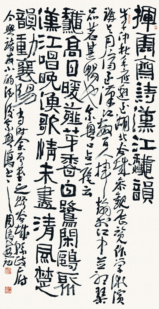 挥云斋诗《汉江秋韵》 戊子仲秋,余应邀至湖北谷城,参观展览,作学术演讲,与同侪至汉江,数百人挥翰于江中,并听琴品茗,甚畅也,乘兴口占一绝云: 秋高日暖薤芽香,白鹭闲鸥聚汉江。唱晚渔歌情未尽,清风楚韵动襄阳。当时余曾书之,赠谷城县政府。今与诸友小酌,酒后乘兴复书之。周俊杰记。 136cm×68cm 创作时间:2008年