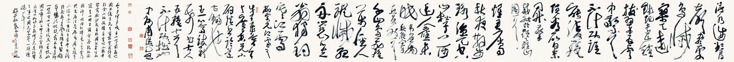 今夕何夕?戊子小寒前夜也。周公俊杰先生寓所突然停电,约余小酌后,权来舍下小憩。吾家客厅沙发甚软,周公甫坐而寐,至十时方寤。吃茶数杯,酒醒神旺,因起挥毫之念。余乃于书房注墨展纸,周公援笔,不假思索,古诗自胸中出,锋颖飞舞若风雨骤至,势雄气畅,龙蛇竟奔不可遏抑。一时辰间,十首唐绝成一长帙也。周公归时,子时已过,余踏月送而叹曰:如此良夜何!兄遗珍宝与弟也。周兄笑答:一抒襟怀耳!