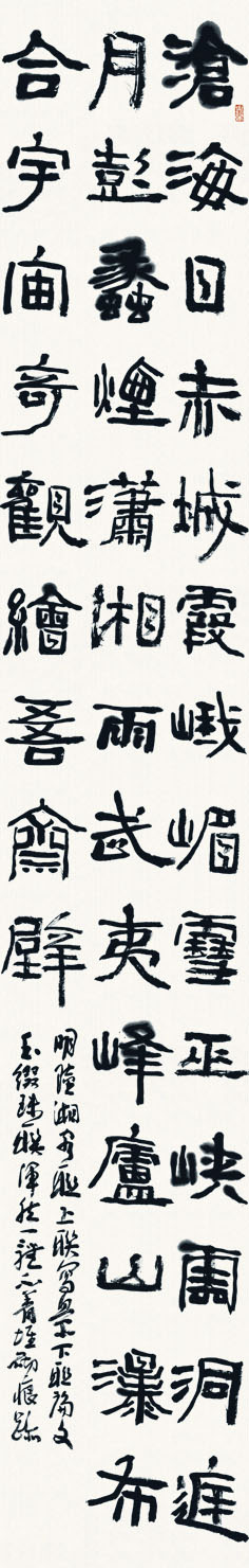 沧海日,赤城霞,峨眉雪,巫峡云,洞庭月,彭蠡烟,潇湘雨,武夷峰,庐山瀑布,合宇宙奇观,绘吾斋壁; 少陵诗,摩诘画,左传文,马迁史,薛涛笺,右军帖,南华经,相如赋,屈子离骚,收古今绝艺,置我山窗。 明陆湘客联。上联写景,下联论文,古今奇书,玉缀珠联,浑然一体,不着堆砌痕迹。中州大梁挥云斋主者周俊杰于古商城北寓灯下也。 366cm×60cm×2