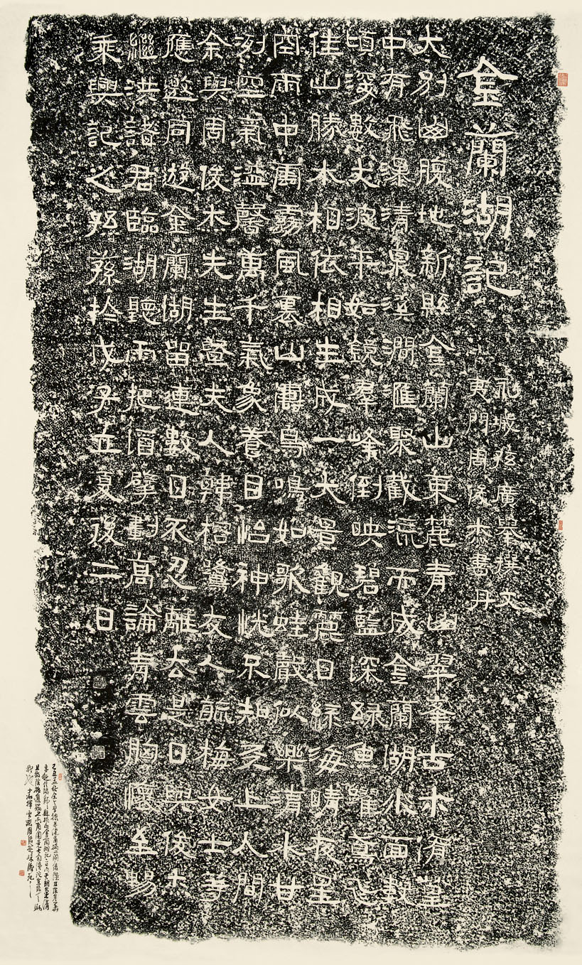 大别山腹地,新县金兰山东麓,青山翠峰,古木修篁,中有飞瀑清泉,溪间汇聚截流而成金兰湖。水面数顷,深数丈,波平如镜,群峰倒映,碧蓝深绿,鱼跃鸢飞,佳山胜水,相依相生,成一大景观。丽日绿海,晴夜星空,雨中云雾,风里山涛,鸟鸣如歌,蛙声似乐。湖水甘冽,空气溢馨,万千气象,养目怡神,恍不知天上人间。余与周俊杰先生暨夫人韩榕鹭、友人毓梅女士等应邀同游金兰湖,留恋数日,不忍离去。是日与俊杰、继洪诸君临湖听雨,把酒擘划,高论青云,胸怀至畅,乘兴记之。孙荪于戊子立夏后二日。