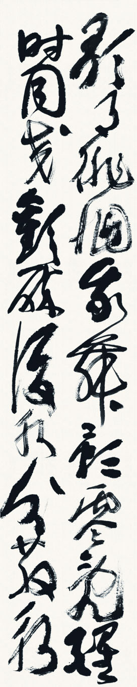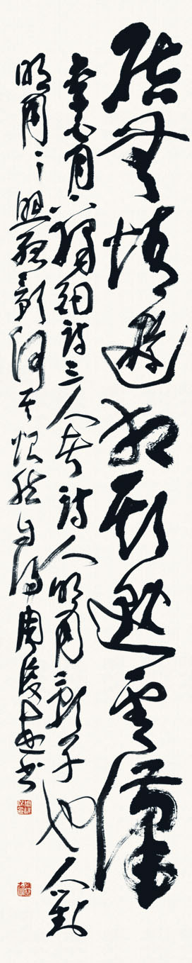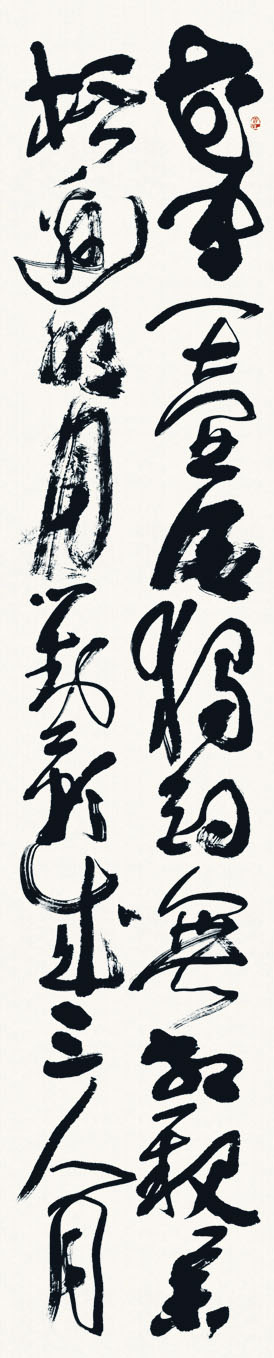 花间一壶酒,独酌无相亲。 举杯邀明月,对影成三人。 月既不解饮,影徒随我身。 暂伴月将影,行乐须及春。 我歌月徘徊,我舞影零乱。 醒时同交欢,醉后各分散。 永结无情游,相期邈云汉。 李白《月下独酌》诗。三人行者:诗人、明月、影子也。人对明月,月照孤影,何其怡然自得。周俊杰书。 180cm×36cm