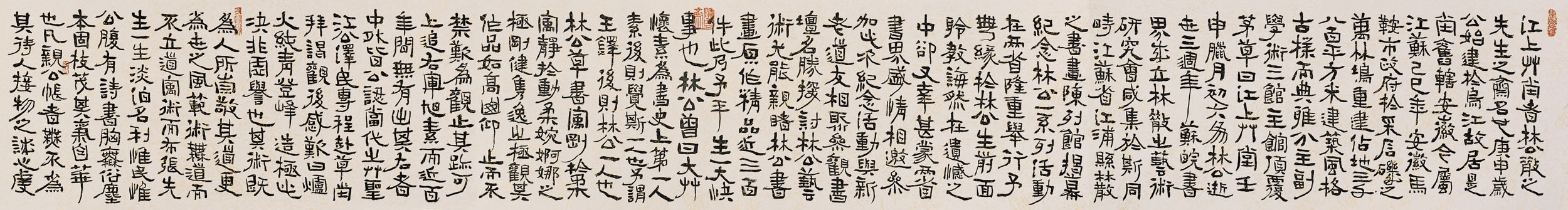 “江上草堂”者,林公散之先生之斋名也,庚申岁,公始建于乌江故居。是堂旧辖安徽,今属江苏。己巳年,安徽省马鞍山市政府于采石矶之万竹坞重建,占地三千八百平方米,建筑风格古朴而典雅,分主、副、学术三馆,主馆顶复茅草,曰“江上草堂”。壬申腊月初六,为林公逝世三周年,江苏、安徽书界成立“林散之艺术研究会”,咸集于斯。同时,江苏省江浦县“林散之书画陈列馆”揭幕。纪念林公一系列活动在两省隆重举行。予无缘于林公生前面聆教诲,然在遗憾之中却又幸甚:蒙两省书界盛情相邀,参加此次纪念活动。与新老道友相聚,参观书坛名胜,探讨林公艺术,尤能亲睹林公书画原作精品近三百件,此乃予平生一大快事也!