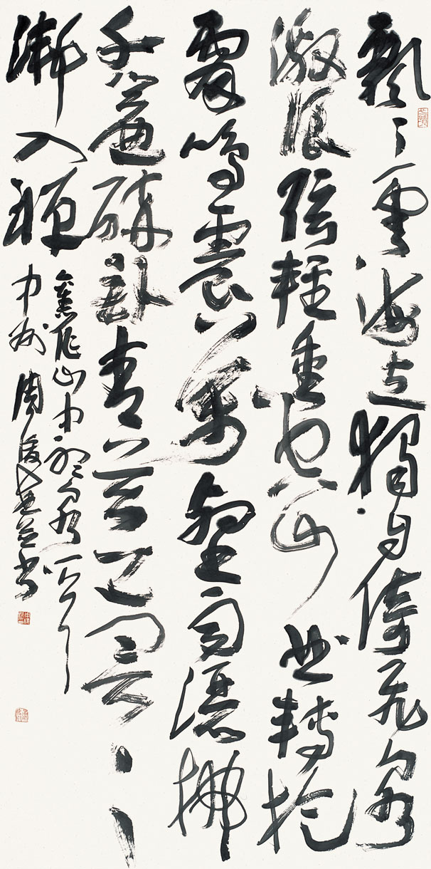 飘飘云海立,独自倚飞泉。 激浪弦轻重,空山曲转旋。 雷鸣传万壑,雨洒拂千帘。 醉卧青苔上,冥冥渐入禅。 旧作《山中听泉》一首。 中州周俊杰并书。 248cm×124cm