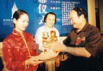由中国文联、中国书法家协会、中国美术家协会共同主办的第一届中国书法兰亭奖和中国美术金彩奖评选近日揭晓。此次共评出10名获奖者,获得书法兰亭奖的是启功、潘文兰,获得美术金彩奖的是王朝闻、华君武、张仃、李剑晨、罗工柳、彦涵、蔡若虹、黎雄才。颁奖仪式和获奖作品展于2001年6月6日在河南郑州裕达国际贸易中心隆重举行。图为河南省郑州市委书记王有杰(右)为金奖得主颁奖。