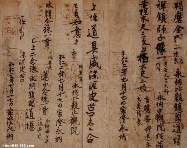 《羯磨金刚目录》,是最澄在从中国大唐带回的众多的“请来品”中,将密教法具、文书经典及六十六种宝物奉纳给比睿山止观院及镇国道场时而写的登记目录。因卷尾有“弘仁二年(811)七月十七日最澄永纳”的识语,可推断是最澄四十五岁时的笔迹。此卷笔法显得极为自然圆浑,随意之中又有严谨认真的态度。