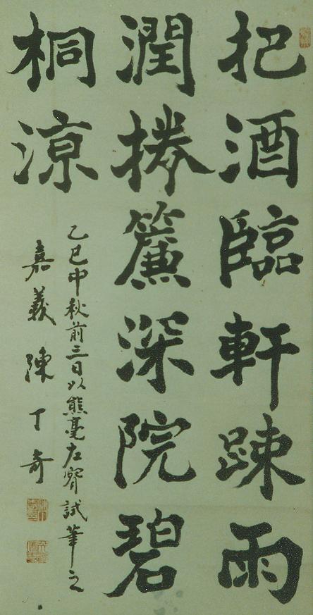 釋文:把酒臨軒疏雨潤, 捲簾深院碧桐涼。 款識:乙巳中秋前三日以熊毫左臂試筆之(1965.9.7) 嘉義 陳丁奇 尺寸:35 x 67 cm